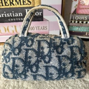 100% authentic Christian Dior terry cloth Diorissmo Boston bag. This is a little cute vintage bag that screams Y2K vibes. The NO. 2 and other white parts of the bag do have discoloration from age. Terry cloth is a mix of light blue and navy. Some minor fading and discoloration to the terry cloth as well. As fading and marks are photographed. Handles are in excellent condition and zipper is zippy. Interior does have some marks but with the material that the lining is- it’s super easy to clean. I quickly wiped down the interior and most came out! No rips or tears to the lining.