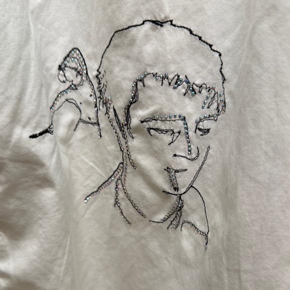 A white long sleeve shirt featuring an embroidered design from Christian Dior's collection, specifically the "Dior and Duncan Grant and Charleston" line. The embroidery depicts a man's face and another figure, possibly inspired by the works or style of Duncan Grant, a British artist associated with the Charleston Group. The design is outlined with black thread and embellished with small, clear rhinestones, adding a subtle sparkle to the garment. This represents a collaboration or tribute within Dior's collection, blending fashion with art historical references.