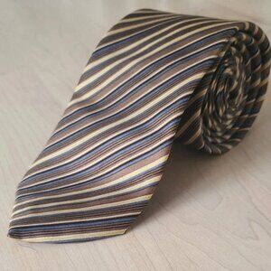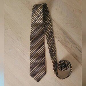 Vintage necktie by Christian Dior. Striped. Brown and yellow with fine blue stripes, giving a gold-ish look.