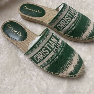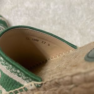 The Dior Granville mule is an elegant and relaxed creation. The style is crafted in embroidered cotton and highlights the deep green Dior Oblique motif. Emblematic House details like the tonal 'CHRISTIAN DIOR' signature on the upper embellish the design, while the rope sole is handmade according to traditional methods. New in box, as per reviews runs true to size, I personally own a pair and sticked to my size 6.5. All items are final sale, kindly message me if you have any questions.
