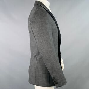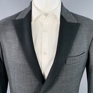 DIRK BIKKEMBERGS sport coat in a grey polyester wool blend fabric featuring a contrasting black grosgrain peak lapel, ventless back, and single button closure. Made in Italy.