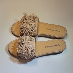 DIRTY LAUNDRY POM POM SLIP ON ROUND TOE SANDAL SIZE 9/40 COLOR CREAM MADE WITH ALL MAN MADE MATERIALS THIS ITEMS IS PRE-OWNED EXCELLENT CONDITION YOU MIGHT MISTAKE FOR NEW CHECK THE PICTURES