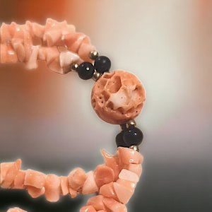 The small black tourmaline accents provide a striking contrast against the delicate pink coral, adding a touch of sophistication and depth to the overall design.