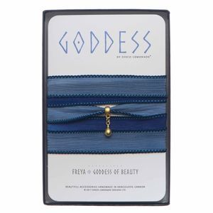 Norse Goddess Freya, was revered for her beauty, love & loyalty. Hers was a tragic story of heartache, as her husband was taken from her. She searched the ends of the earth for him to no avail. It is believed that Freya wept tears of gold for her beloved. Her never ending love is embodied in our silk ribbons of sky blues.