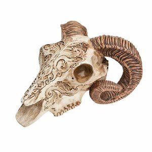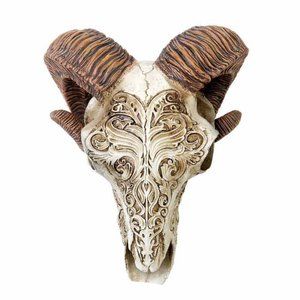 New in presentation box. Alchemy Gothic resin ram's skull with intricate scrollwork on the skull and detail on the horns. Worshipful head of the cult of Ammon, carved with scrimshaw foliate forms that symbolize the eternal cycle of birth and regrowth.
