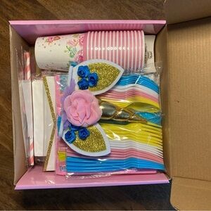 DISCOVERING DIY UNICORN BIRTHDAY PARTY SUPPLIES, NEW, UNICORN PARTY. INCLUDES: 10 CANDLES, 16 SPOONS, FORKS, KNIVES, CAKE SERVER. 16 LARGE AND SMALL PLATES, 16 NAPKINS, 16 CUPS. PLASTIC TABLE CLOTH, 16 PARTY FAVOR BAGS, HAPPY BIRTHDAY BANNER, CAKE TOPPER.