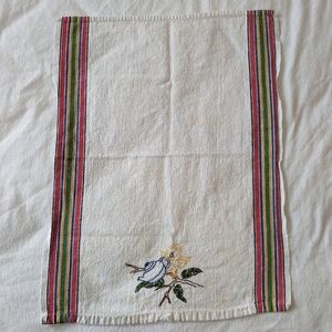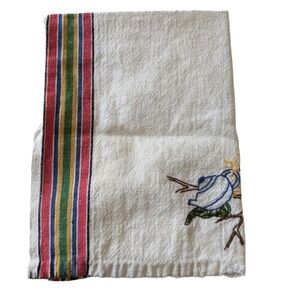 1940s vintage cotton dish towel with an embroidered tea pot and bird. This soft weathered towel would look great in a farmhouse kitchen or to be used to dry curly hair because it doesn't cause frizz like terry.