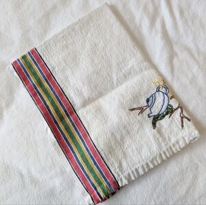 DISHTOWEL Vintage Farmhouse Embroidered Bird Teapot Cotton Red White Yellow