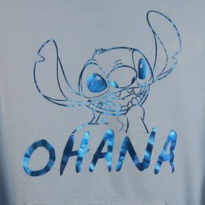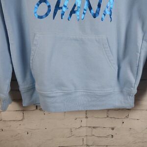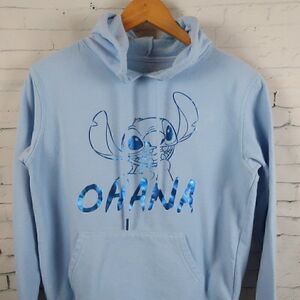 BLUE FOIL LILO & STITCH OHANA LONG SLEEVE PULLOVER HOODED SWEATSHIRT WITH KANGAROO POCKET SIZE MEDIUM BY DISNEY PRE OWNED NO FLAWS