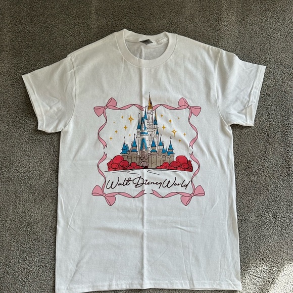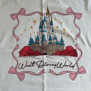 ~ white tee featuring a colorful castle graphic. Pink bows and red roses add charm. 🏰🎀