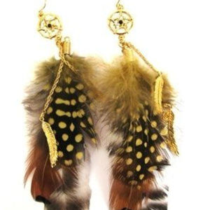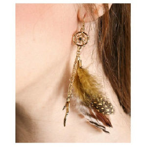 ONLY **3** PAIRS LEFT!!! NEW WITH TAG!!! DISNEY COUTURE POCAHONTAS NATURAL FEATHERS/14KT GP FEATHER CHARMS EARRINGS**Earrings have Natural Feathers (Every Pair of Earrings has a slightly different color/pattern since they're genuine feathers-not manufactured feathers) with 14KT Gold Plated Feather Charms dangling. The posts are Dream catchers with a Black Swarovski Crystal in the middle!**1.5" Wide/4.5" Tall/Weight: 7.0 Grams/Fish Hook posts**NEW WITH TAG (Note: Earrings don't come w/ the Disney Couture Pouch)