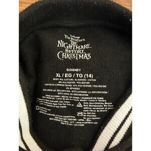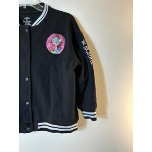 Designed in a black hue with white varsity stripes on the stand-up collar and cuffs in black, it features a Sally applique patch on the chest with "The Nightmare Before Christmas" logotype on one sleeve, while the back features different apothecary jars beneath it