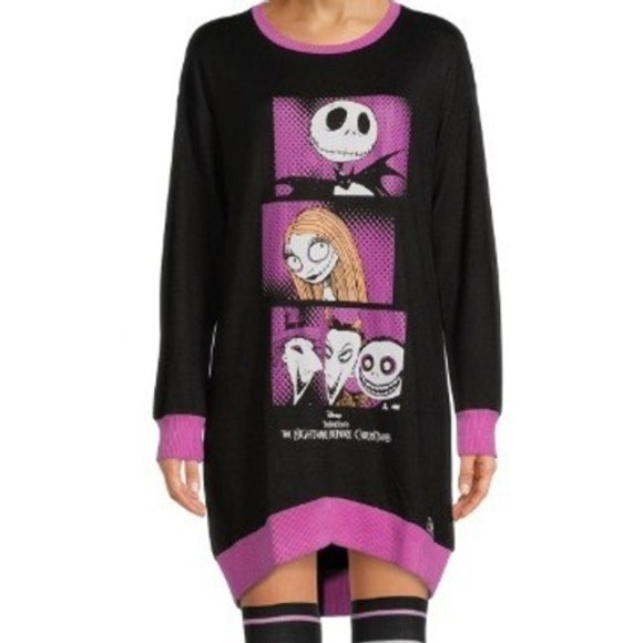 Disney Tim Burton's The Nightmare Before Christmas graphic sleepwear tunic. This black long-sleeve tunic features a vibrant graphic panel on the front with Jack Skellington Sally and Lock Shock and Barrel. Contrasting purple trim accents the neckline cuffs and hemline. Perfect for cozy nights or lounging around the house.