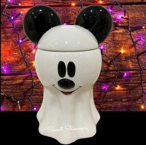 Brand New, ceramic, Halloween Ghost Mickey & Minnie Mouse Mugs with toppers, Ceramic Mickey Ghost Cookie Jar /Canister with lid, & a matching Ceramic Mickey & Minnie Ghost Salt Pepper Set by Disney/zirke. Sooooo cute!!