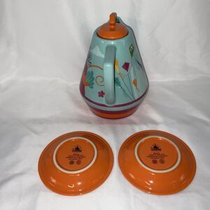 Set includes tea pot, 2 tea cups, and 2 saucers.