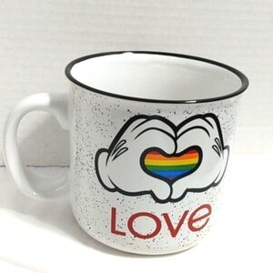 DISNEY MICKEY MOUSE NWOT LOVE UNITED MUG 20oz. WALT DISNEY NWOT LOVE UNITED MUG SIZE 20oz. CONDITION: EXCELLENT - NEW WITHOUT TAGS SIZE: (L) LARGE - 20oz. COLOR: WHITE / MULTI RAINBOW STYLE: Walt Disney Drinking Mug DESIGN: Front/Back - Mickey Mouse Hands Holding Rainbow Heart, LOVE embossed along base of mug. CRAFT: Ceramic