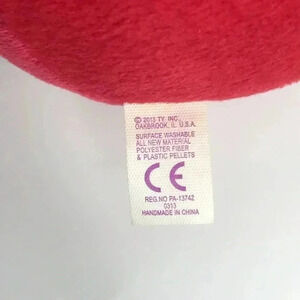 This Disney Mickey Mouse Ty plush is dated 2013. He is in the shape of a ball and is filled with polyester fibers and pellets. He is approximately 5" H.