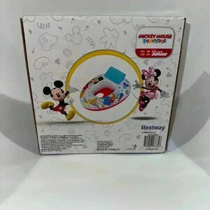 This is a new, unopened Bestway Disney Junior Mickey Mouse Baby Watercraft. It is designed for children ages 6-18 months. The watercraft is made of inflatable vinyl and features a Mickey Mouse design. It has a built-in backrest for added comfort. The watercraft is packaged in a box with a picture of a child using it. The box also includes the dimensions of the watercraft both inflated and deflated. The dimensions are as follows: Inflated Size: 27 in. x 22.5 in. x 8 in. / 69 cm x 57 cm x 21 cm. Deflated Size: 30 in. x 25.5 in. / 76 cm x 65 cm. The watercraft is in new condition with tags and box.