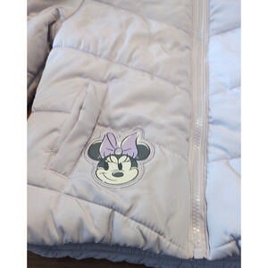 This is a Disney Minnie Mouse puffer jacket in size 4T. It features Minnie Mouse ears and a bow accent, with a softshell fabric. The jacket has a zip closure and is lined for added comfort. Perfect for travel or casual wear, this cute jacket is a must-have for young girls who love Disney's Minnie Mouse character.