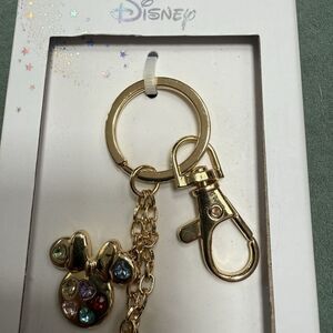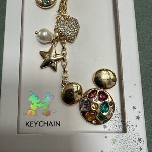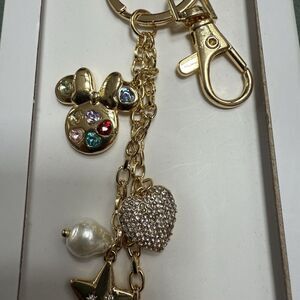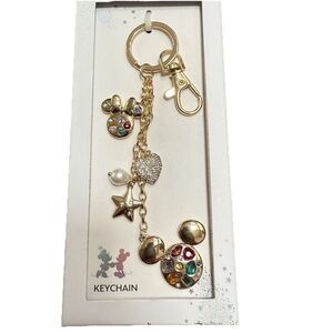 Here is a DISNEY Mickey & Minnie Mouse Bag Charm Keychain Gold Tone Colored Gems Star New