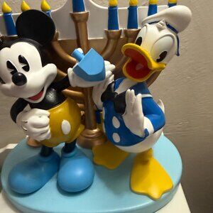 Bring in Disney magic into your home for this Hanukkah season with this Mickey Mouse and Donald Duck figurine, featuring a Menorah and Dreidel. This collectible showcases the iconic Disney characters Mickey Mouse and Donald Duck in a holiday themed setting. Perfect for fans of Disneyana and collectors of contemporary figurines, this unique piece would make a charming addition to any Disney memorabilia collection. Very rare and unique piece.