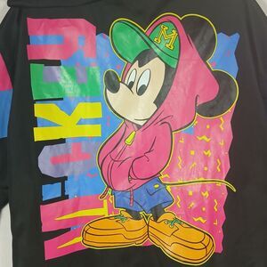The product is a vintage Disney Mickey Mouse windbreaker jacket, featuring a 1/3 zip design with a hood, in medium size. The black jacket is part of the Disney franchise and suitable for both men and women. Made in China in the year 2000, this collectible item is a nostalgic piece for fans of Mickey Mouse and Disney. Perfect for adding a touch of retro charm to any outfit, this jacket is a must-have for Disney enthusiasts looking to showcase their love for the iconic character.
