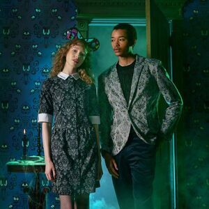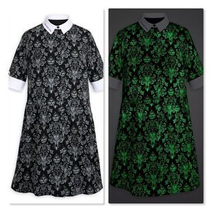 With an allover glow-in-the-dark print that echoes the mansion's iconic wallpaper, dramatic white collar and cuffs, and cheeky embroidery, this gorgeous gothy dress is filled with vintage-inspired style that is sure to liven your wardrobe and haunt your dreams.
