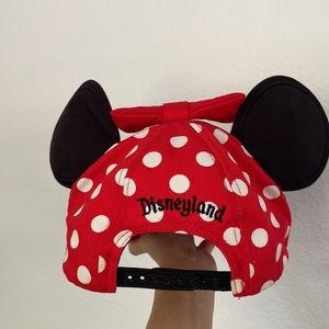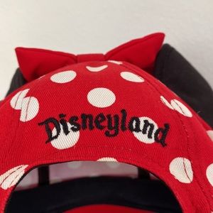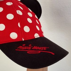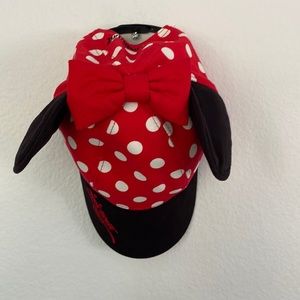 Pre owned DISNEY PARKS Minnie Mouse embroidered signature hat with ears & bow SIZE YOUTH. Adorable red and white polka dots with a black brim and ears. Love how the brim has Minnie Mouse’s signature embroidered on. Also has DISNEYLAND embroidered on back. This hat is adjustable. In excellent condition. See pictures for details and condition.