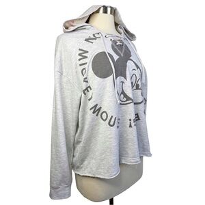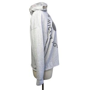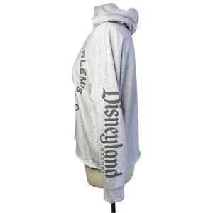 This heather gray long sleeve hoodie top from Disneyland makes the perfect piece for a day at the parks! It features lace up front, Mickey print lined hoodie, raw edge hem, and Disneyland printed sleeve! Preowned and in excellent condition!
