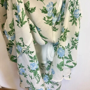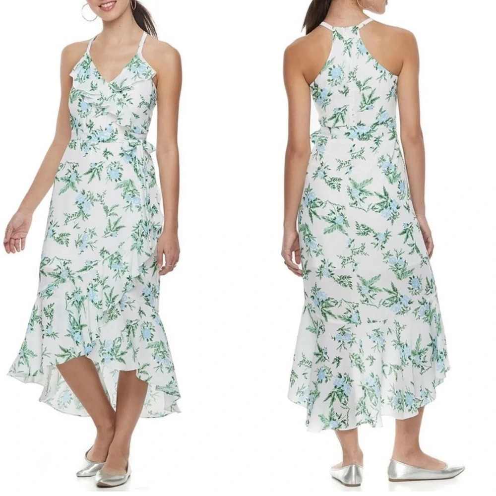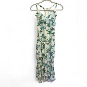 Beautiful floral midi dress with zipper closer on racer back and spaghetti straps. Belt that ties around the waist. Flutter bottom. No stains, holes, or odors.