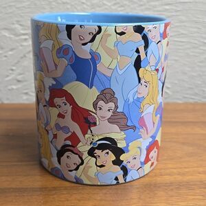 Colorful mug featuring Disney princesses Cinderella, Sleeping Beauty, Jasmine, Ariel, Belle. Blue handle adds a charming touch. Measures approximately