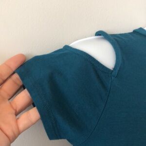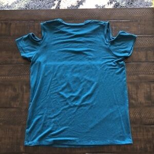 This was washed once in preparation to wear and then that never happened. It belonged to my daughter. This is an extremely soft quality tee bought directly from Disneyland. We were pass holders. Cold Shoulder design. Smoke free home.