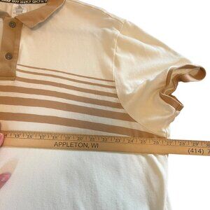 Retro-inspired Star Wars polo shirt featuring the Death Star and TIE Fighter graphic. Beige and white striped design with contrast collar and cuffs. Perfect for any Star Wars fan looking for a casual yet unique piece.