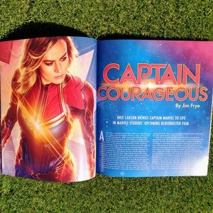 Included folded small double-sided Captain Marvel Movie Poster with reverse side characters and black rectangular D23 Official Disney fan club patch on the back of the magazine.