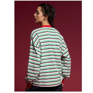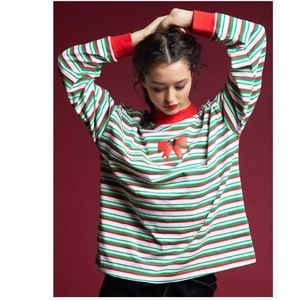 Add a dash of Disney cheer to your holiday season with this Mickey Holiday Stripe Long Sleeve Shirt from Hot Topic! Designed in festive red and green stripes, this cozy long-sleeve tee features a playful puff-printed red bow and classic Mickey Mouse head graphic. The red mock neck and drop-shoulder design give it a trendy, relaxed fit that’s perfect for lounging, layering, or spreading holiday joy in style. New with tags.