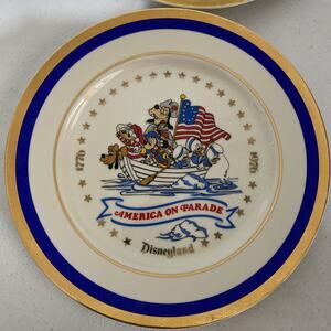 The Disneyland America on Parade Plates Set of 2 featuring Mickey Mouse from 1976 is a limited numbered collectible item made in the United States. This set of plates showcases the beloved Disney character, Mickey Mouse and his Friends, in a patriotic theme, perfect for any Disney or Mickey Mouse fan's collection. With its nostalgic design and limited availability, these plates are a unique and special addition to any Disneyana or contemporary plate collection.
