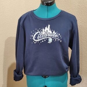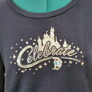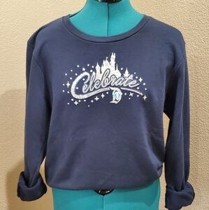 Disney Parks exclusive Disneyland Resort 60th anniversary Diamond Jubilee Celebration. Navy blue crewneck long sleeve cotton blend light to mediumweight sweatshirt. "Celebrate" in silver sequins Sleeping Beauty's castle in silver glitter. Silver glitter "D" and Diamond graphic with clear rhinestone accents. From 2015.