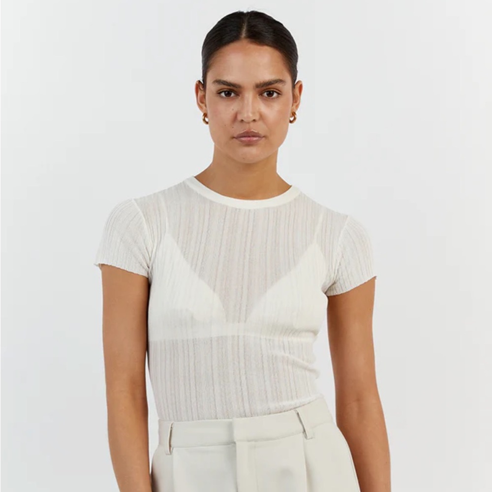 Stylish ivory ribbed tee with short sleeves. Perfect for layering or wearing alone.