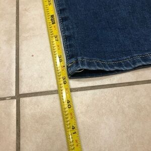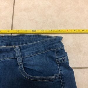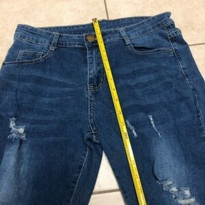 Distressed medium wash jeans, large, no specific size shown but measurements indicated, 10% spandex so lots of stretch, gold stitching, five pockets, holes and rips shown, these jeans are in great condition. Medium wash.