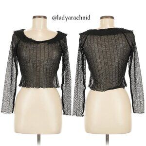 Sonya is 5’5” and wearing a UK8. Undergarments not included. Measures about 16" pit to pit and 16" shoulder to hem. 🔥NOTE: Disturbia usually does not put brand/size tags in the collar of sheer items like this so as not to ruin the look of the garment. Size/care tag is in the seam near the waist. Excellent preowned condition with no snags or holes. Smoke free home but we do have pets. BIN22