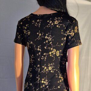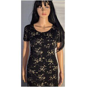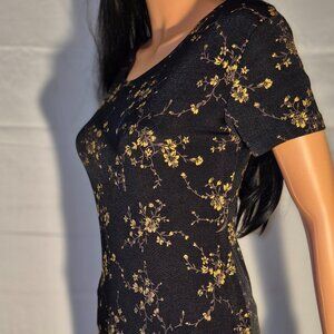 The dress is dark Black with a shimmering Metallic gold thread floral design/ front and back