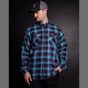Men’s black, aqua blue, purple, and pink plaid patterned flannel shirt