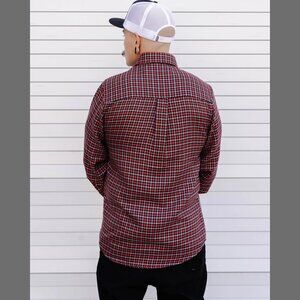 Men’s red, black, and gray houndstooth patterned flannel shirt