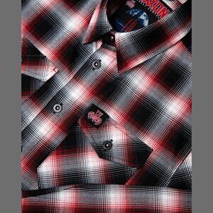 Men’s black, red, and white plaid patterned flannel shirt