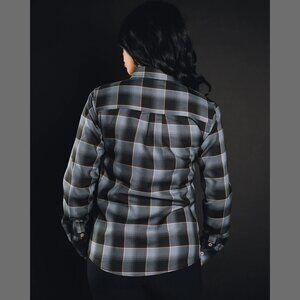 Women’s gray, black, tan, and red plaid patterned flannel shirt