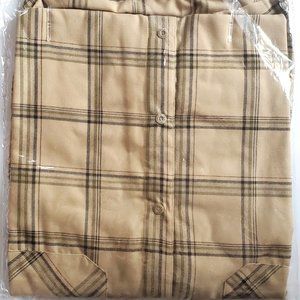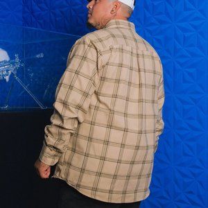 Men’s khaki, green, brown, and black plaid patterned flannel shirt