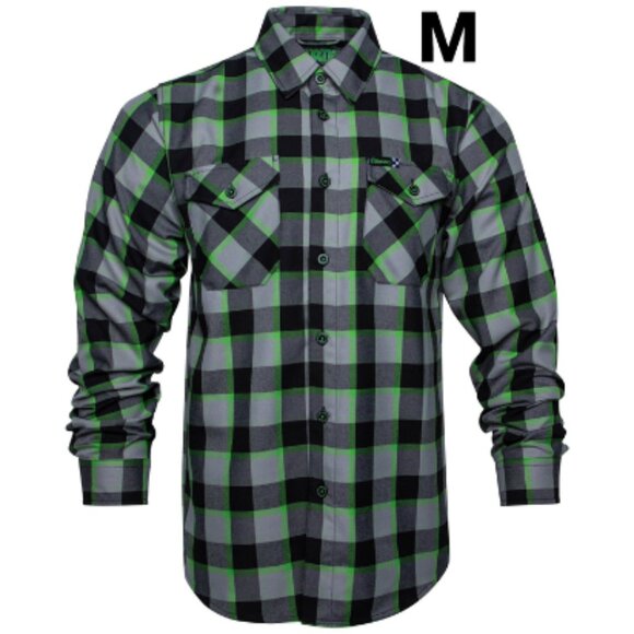 Men’s gray, black, and neon green plaid patterned flannel shirt
