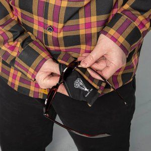 Men’s red plum, honey and black plaid patterned flannel shirt
