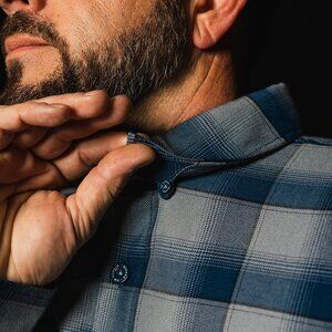 Men’s blue, gray, and black plaid patterned flannel shirt