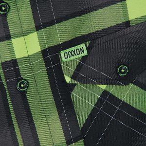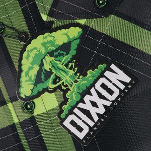 Green and black Dixxon brand tag on the left chest pocket